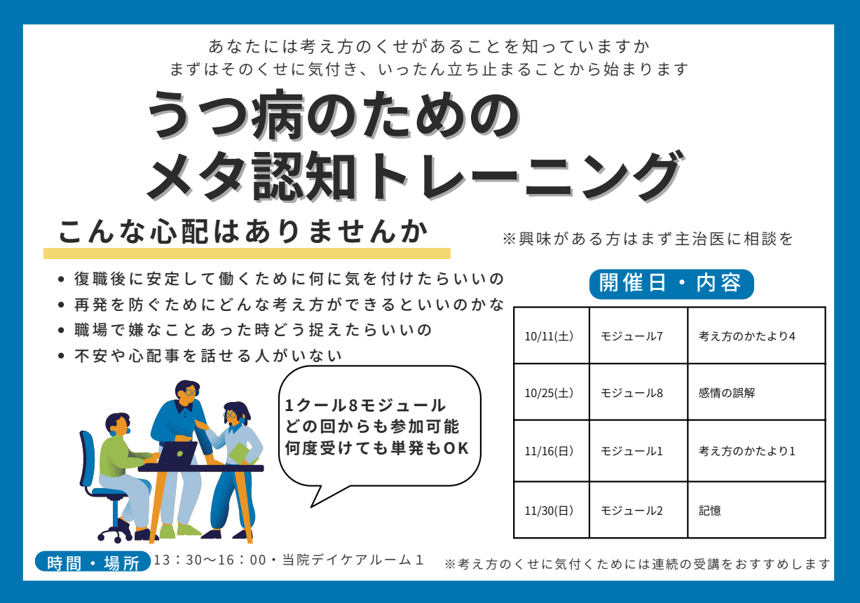 当院では、気分の落ち込み・不眠・不安などの症状でお悩みの方の体調・心の回復をサポートをいたします。お話を伺い、症状に合わせた治療を提案させていただきます。また、ゴールを定めた治療を行います。まずは、お気軽にご相談・お問合せください。