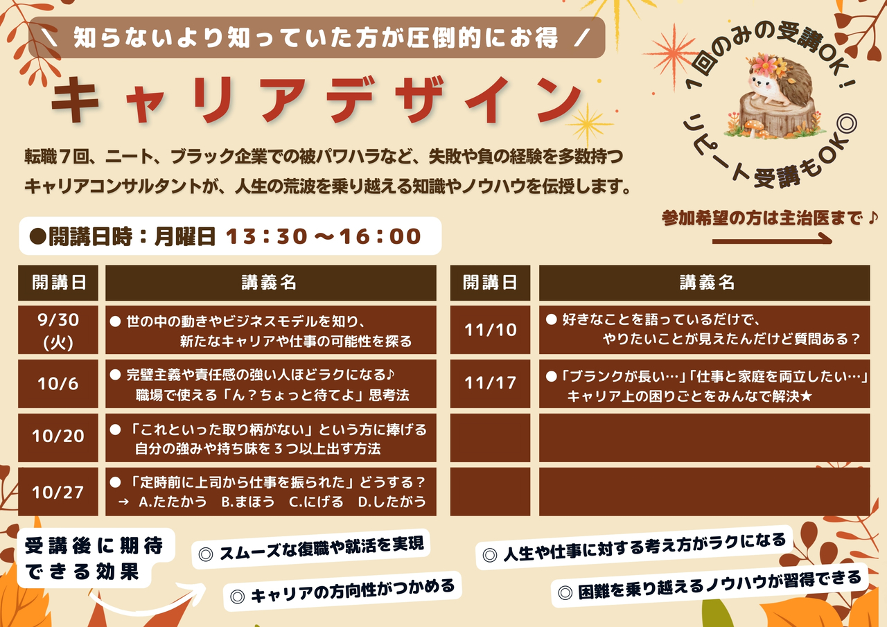 「一般雇用と障害者雇用のどちらがいいのか」「復職と転職で悩んでいる」「自分に合う仕事がわからない」などのお悩み解決にキャリアコンサルタントがお手伝いします。