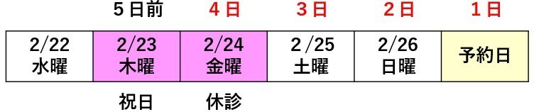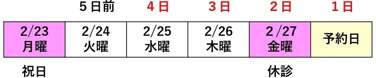 以降は、キャンセル料 5000円 が発生いたします。ただし、5日前が祝日の場合は、その次の診療日までにご連絡ください。